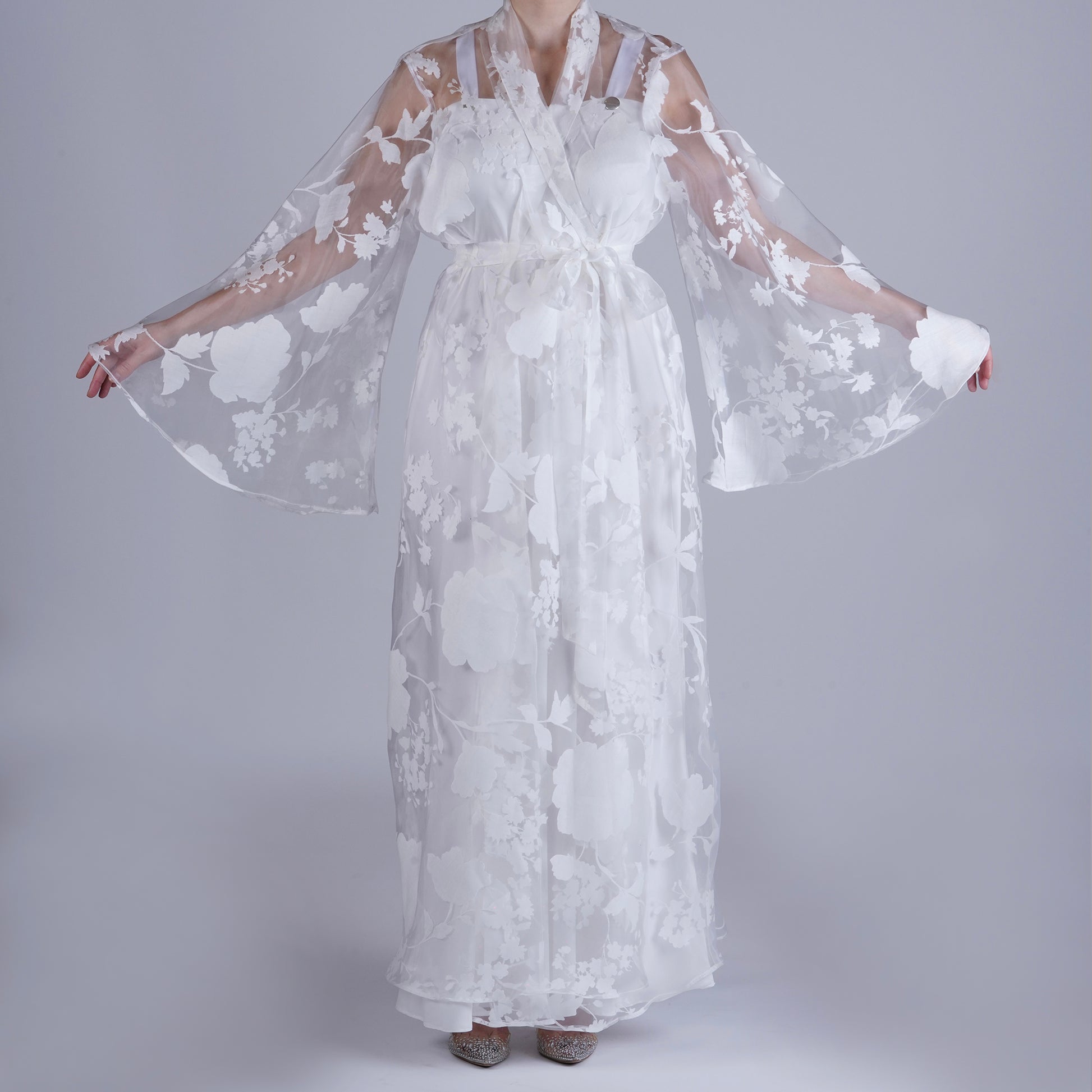 Handmade White Organza Robe with Floral Details